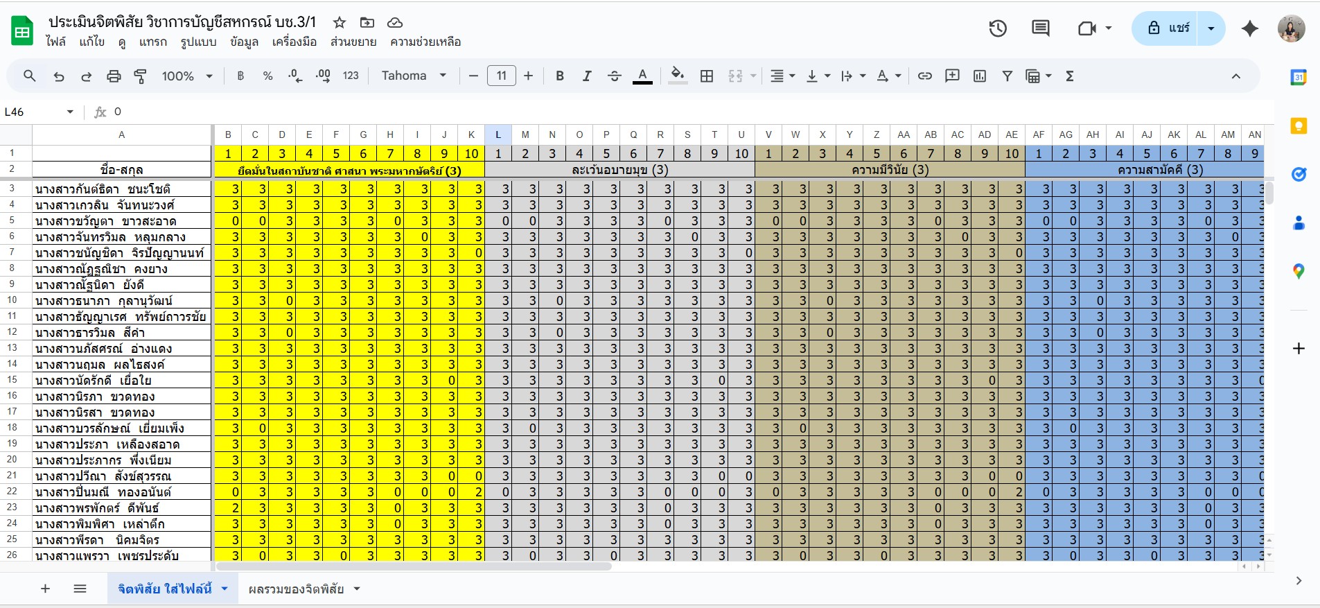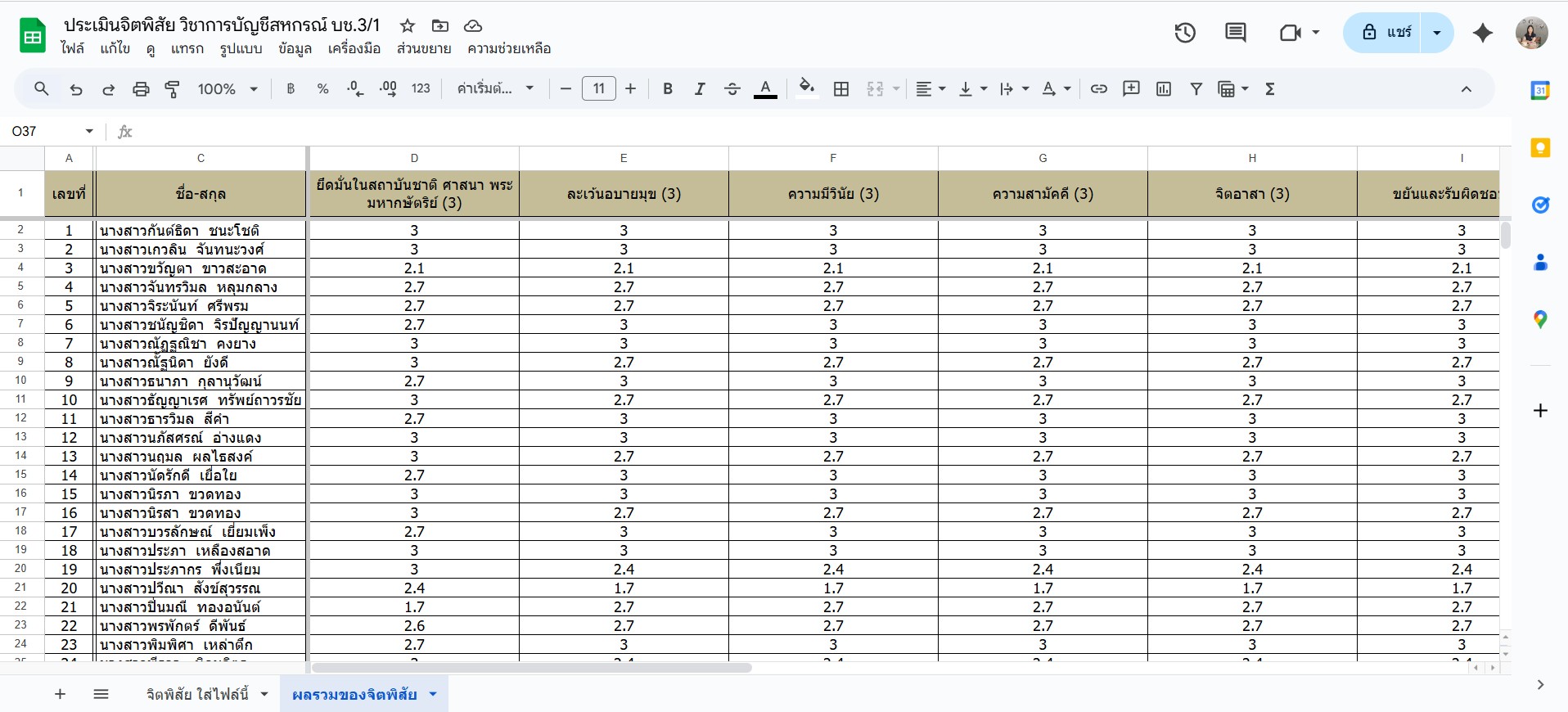 ►บันทึกคะแนนคุณธรรมและจริยธรรมวิชาโปรแกรมสำเร็จรูปเพื่องานบัญชี สกบ.1/1 (สอนสัปดาห์ที่ 10-12)