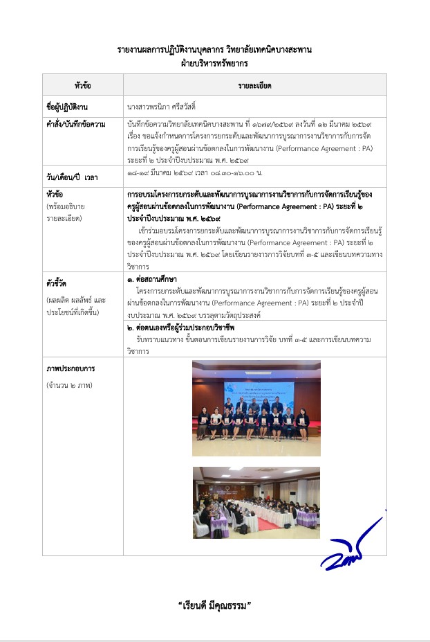 เข้าร่วมอบรมโครงการยกระดับและพัฒนาการบูรณาการงานวิชาการกับการจัดการเรียนรู้ของครูผู้สอนผ่านข้อตกลงในการพัฒนางาน (Performance Agreement : PA)