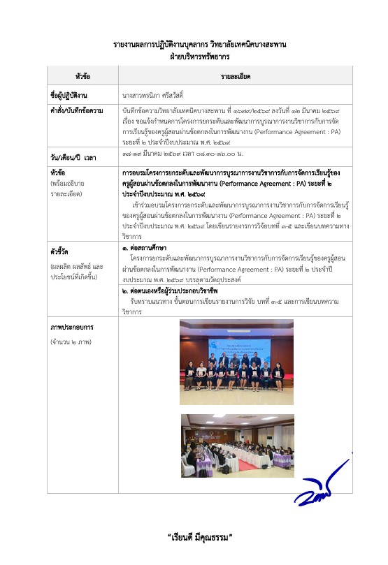 นำความรู้ที่ได้จากการอบรม ' โครงการยกระดับและพัฒนาการบูรณาการงานวิชาการกับการจัดการเรียนรู้ของครูผู้สอนผ่านข้อตกลงในการพัฒนางาน (Performance Agreement : PA) ระยะที่ 2 ประจำปีงบประมาณ พ.ศ. 2569' ระหว่างวันที่ 18-19 มีนาคม 2569  มาใช้สำหรับการเตรียมดำเนินการจัดทำ